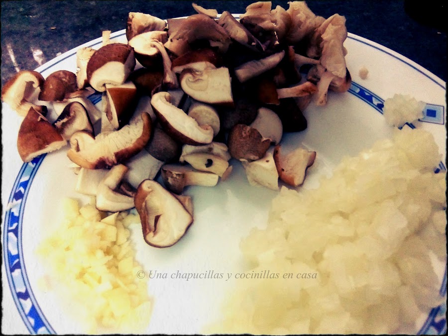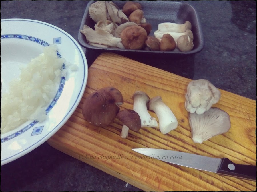 Lo primero, picar un poco las setas, el ajo en trocitos y la cebolla en dados pequeños (brunoise).