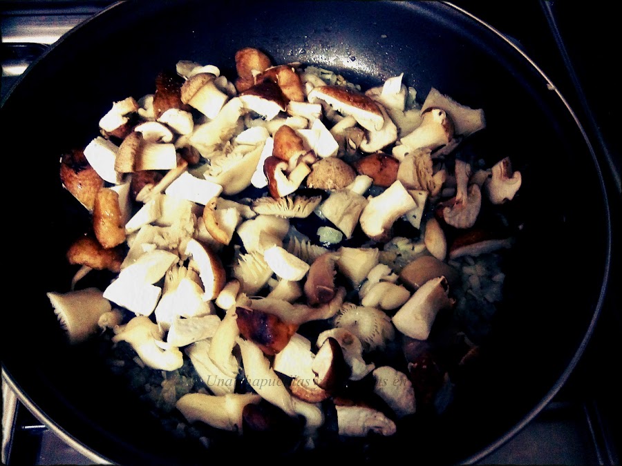 Cuando empiece a transparentar y coger color la cebolla, echar las setas y saltearlas unos minutos, tampoco demasiado.