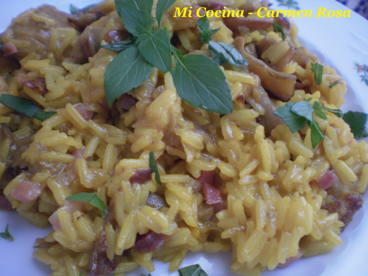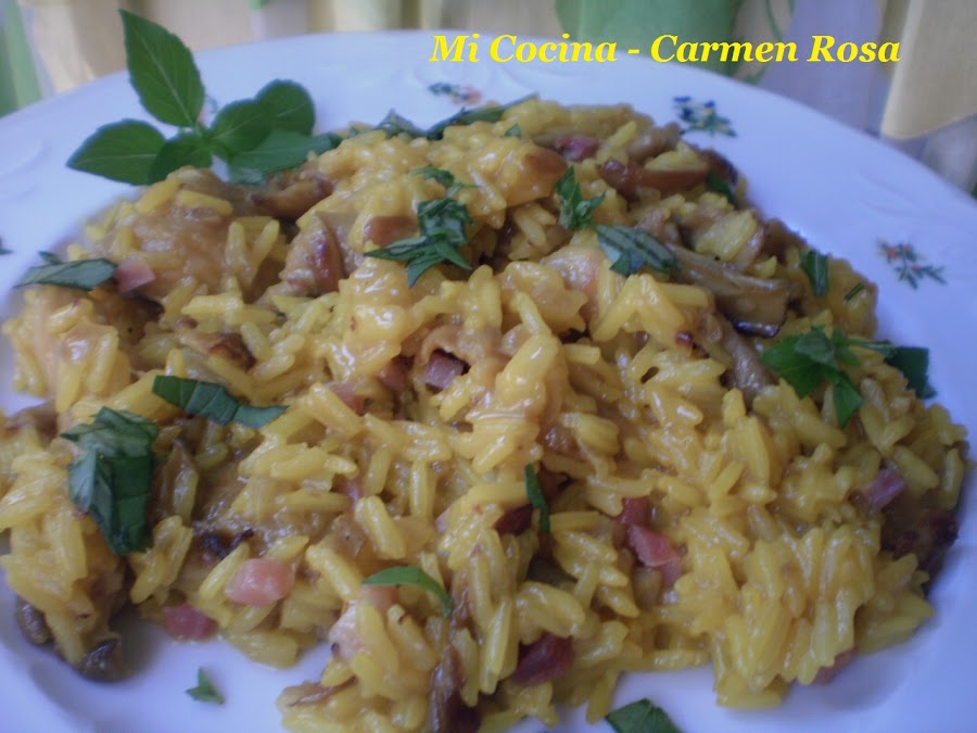 Tres puñados de arroz en ésta ocasión usé tipo Thai (por comensal), 25 grmos.de mantequilla, un vaso de caldo de jamón (aqui encontrarán la receta)un vaso de caldo, 50 grms. de jamón serrano, setas, cuatro cucharadas de queso curado de oveja rallado, media cebolla blanca pequeña, azafrán (en su defecto colorante alimentario), sal y albahaca fresca.