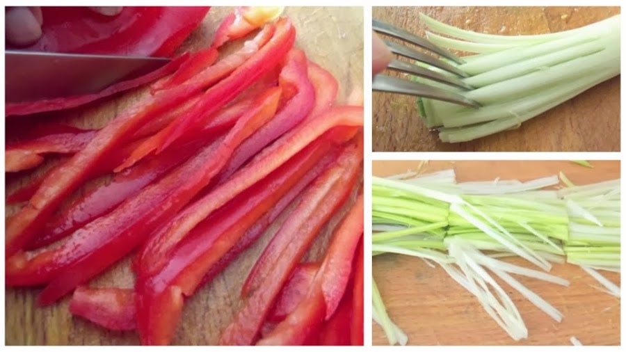 Mientras se hace la carne, picamos en julianas muy finas el pimiento rojo, el pimiento verde, el puerro, los ponemos al fuego en un recipiente grande con aceite, cuando estén medio hechas, agregar la carne ya desmechada, revolvemos muy bien, ajustamos la sal y dejamos a fuego medio para que se mezclen los sabores, si se secan las verduras, agregar un par de cucharadas del caldo de carne para que se mantengan húmedas sin que se haga caldo, solo que se hagan las verduras. Reservar.