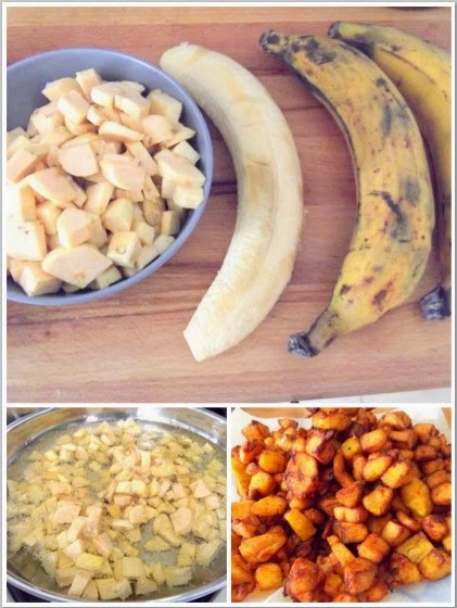 Mientras se hacen las verduras y la carne, ponemos al fuego una sarten con abundante aceite, Pelamos el plátano macho maduro en cuatro partes a lo largo y picamos las partes como si fueran rodajas, freímos en aceite caliente hasta que estén hechos. Retirar del fuego, poner sobre papel absorbente y reservar.