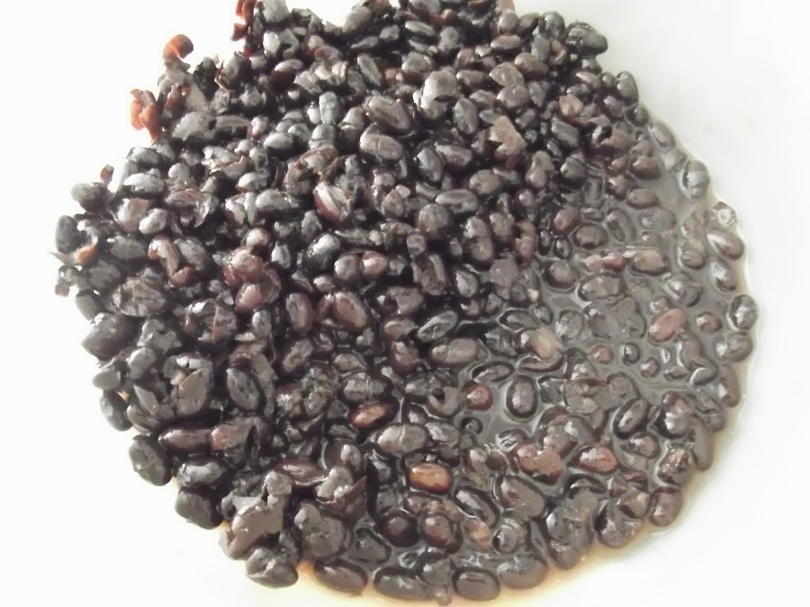 El día anterior ponemos las caraotas (judias negras o frijoles ) en agua a ablandar, el agua quedará negra, en estas misma agua los ponemos en la olla express a cocer hasta que esten al dente, por aprox. 30 minutos. Reservamos.