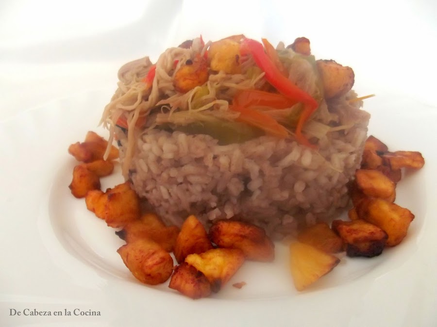 Para montar el plato, ponemos primero el arroz, encima ponemos un poco de carne con verduras y encima regamos un poco de plátano frito. Servir caliente.