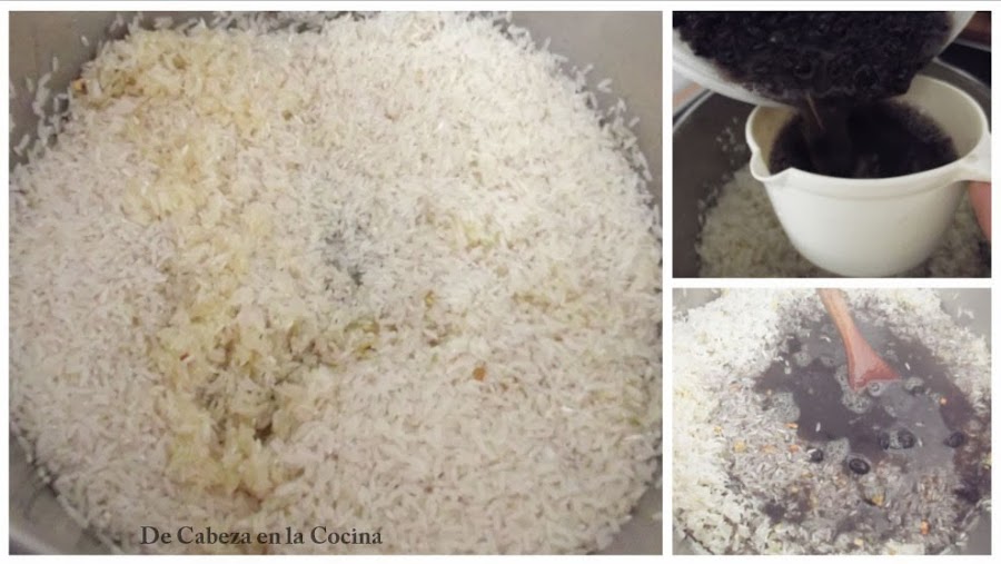 Hacemos el arroz, ponemos el aceite en un recipiente que vaya al fuego, cuando se caliente a fuego medio, agregamos la cebolla y cuando este casi hecha agregamos el ajo finamente picado, cuando este frito el ajo agregamos el arroz, las caraotas y el agua de las caraotas. La medida del agua debe ser, el doble de tazas de la medida de arroz menos uno, esto para que quede suelto el arroz. Luego ponemos sal al gusto, bajamos el fuego a mínimo, tapamos la cazuela y dejamos por mas o menos 20-25 minutos a que este hecho, debe quedar suave y esponjoso, retirar del fuego y pasar a un bol grande para esparcirlo y que no se pase. Reservar.