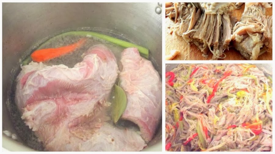 Hacemos la carne, el la olla express, ponemos la carne, agregamos el laurel, el comino, la zanahoria, el apio, la sal y llevamos al fuego por 45 minutos o hasta que este blanda, retirar dejar enfriar y desmechar.