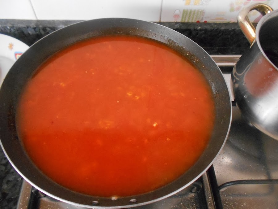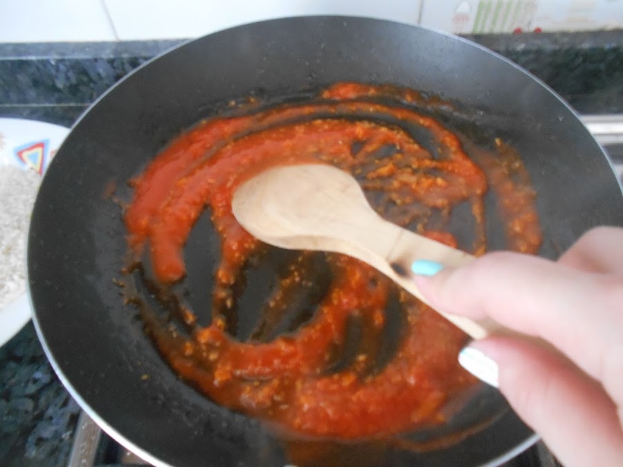 Echamos los ajos machacados, la salmorreta y el tomate frito. Rehogamos un par de minutos