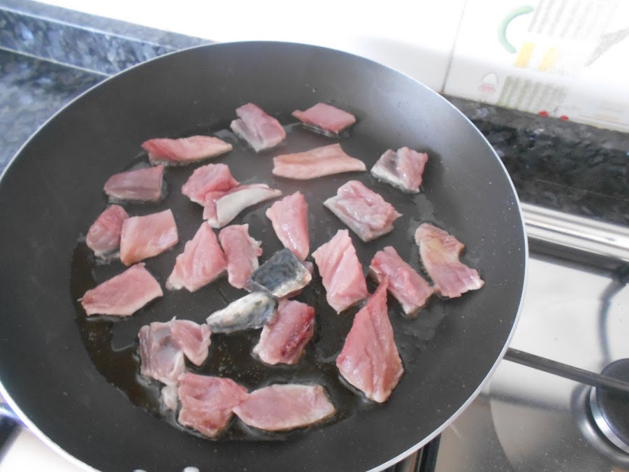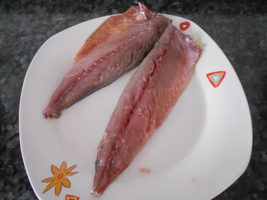 Limpiamos de espinas la caballa y la cortamos en trozos.