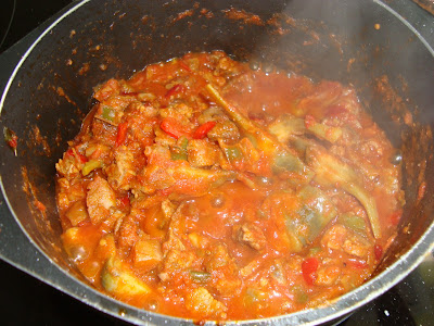 En la sarten del sofrito poner el pimentón y freir un poco y enseguida añadir los tomates, dejar hasta que el tomate esté bien frito.
