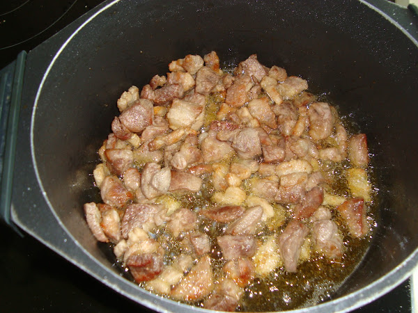 En una sartén o cazuela con aceite de oliva suficiente para cubrir el fondo y bastante caliente freir la carne y panceta hasta que esté dorada, sacar y reservar.