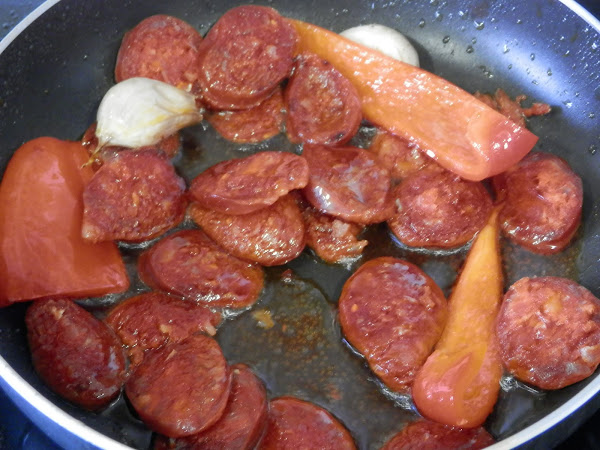 Añadiremos ahora el chorizo partido en rodajas.