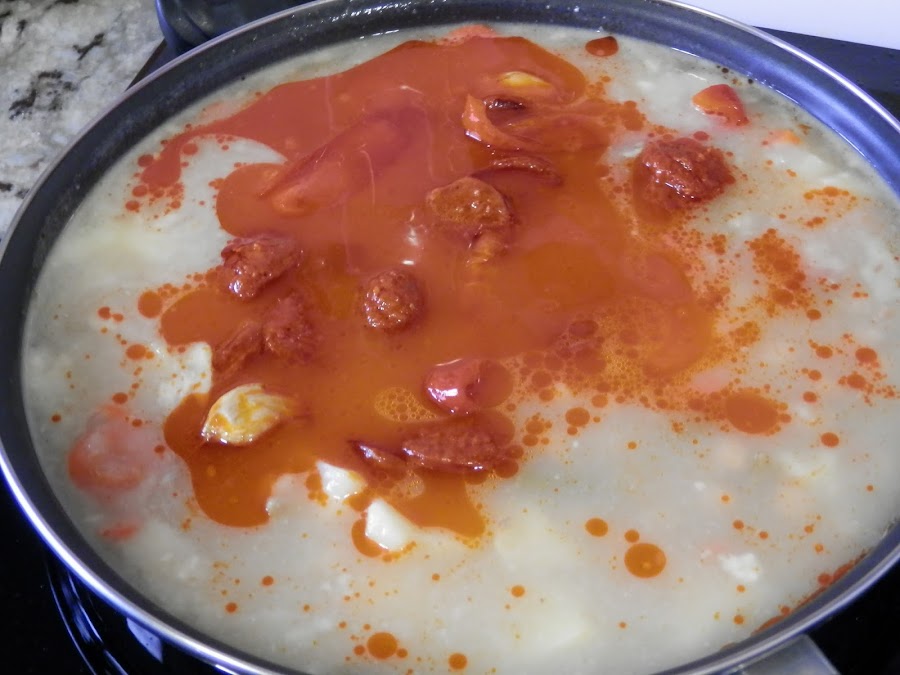 ¿Lo tenemos? Ahora añadimos el cocido y dejamos cocer todo junto durante media hora.