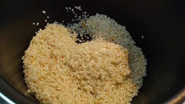 Saltea los ajitos en menú sofreír. Continúa hasta el sellado del arroz. Cancela y programa menú guiso, presión predeterminada y 7 minutos. Añade una pizca más de agua que para la fussioncook, alrededor de 2 vasos y 1/2 en total. Al terminar despresuriza inmediatamente