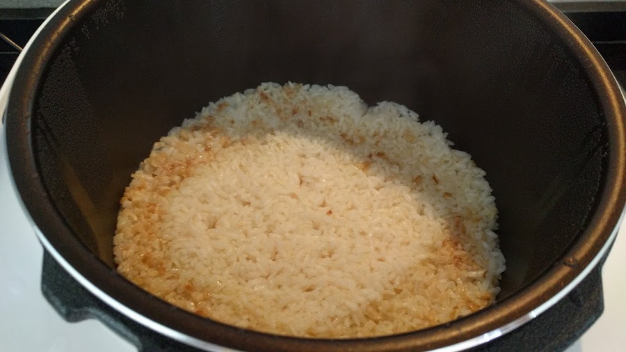 Programamos menú arroz. Yo elijo textura al dente. Echamos el agua y removemos bien. Prueba el caldo y rectifica la sal si es necesario. Cierra, válvula cerrada y deja que termine el tiempo