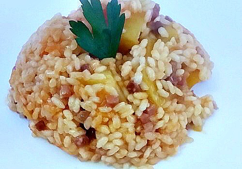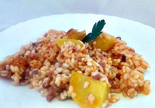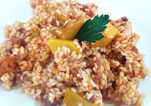 Este arroz me lo contó mi prima Carmen y creo que ella lo conoció a través de su abuela “La tía Carmen”, como se la conocía en el pueblo, una persona cariñosa, generosa y buena. Y dejó en herencia a su nieta esta personalidad y también la receta de este arroz. Carmen me contó que éste es un arroz típico de Siete Aguas que se le llama “Arroz de haragana”, aunque también lo conocían como “Arroz de putas”. Haragana significa “vaga” y se le llama así porque no cuesta nada de hacer: cuando tienes prisa en preparar una comida para tu familia ¿Quién no tiene un poco de jamón serrano en la nevera y una patata? En menos de una hora lo tienes todo hecho. Por eso, este arroz es para mujeres (sólo mujeres, eso sí, porque no se llama de “haraganos”) que no utilizan su tiempo ni en cocinar ni en comprar. Eso en mi pueblo es una haragana. En fin, cosas de los pueblos.