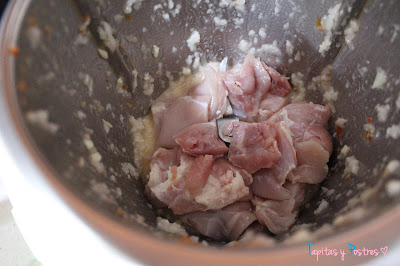 Añadimos la pechuga en trozos o contramuslos troceados que es lo que yo usé. Vamos a sofreir cinco minutos, a 120º, giro inverso y velocidad cuchara.