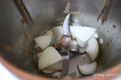 Sin lavar el vaso ponemos el aceite, los ajos y la cebolla y trituramos 5 segundos a velocidad 5.
