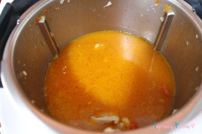 Y el caldo casero que teníamos reservado. Cocinamos unos 15 minutos, a 100º , giro inverso y velocidad cuchara.