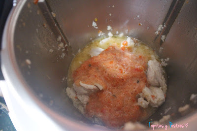 Como vamos a usar tomate natural lo troceamos y trituramos 10 segundos a velocidad 7. Reservamos. Si usamos tomate en conserva triturado, saltamos este paso.