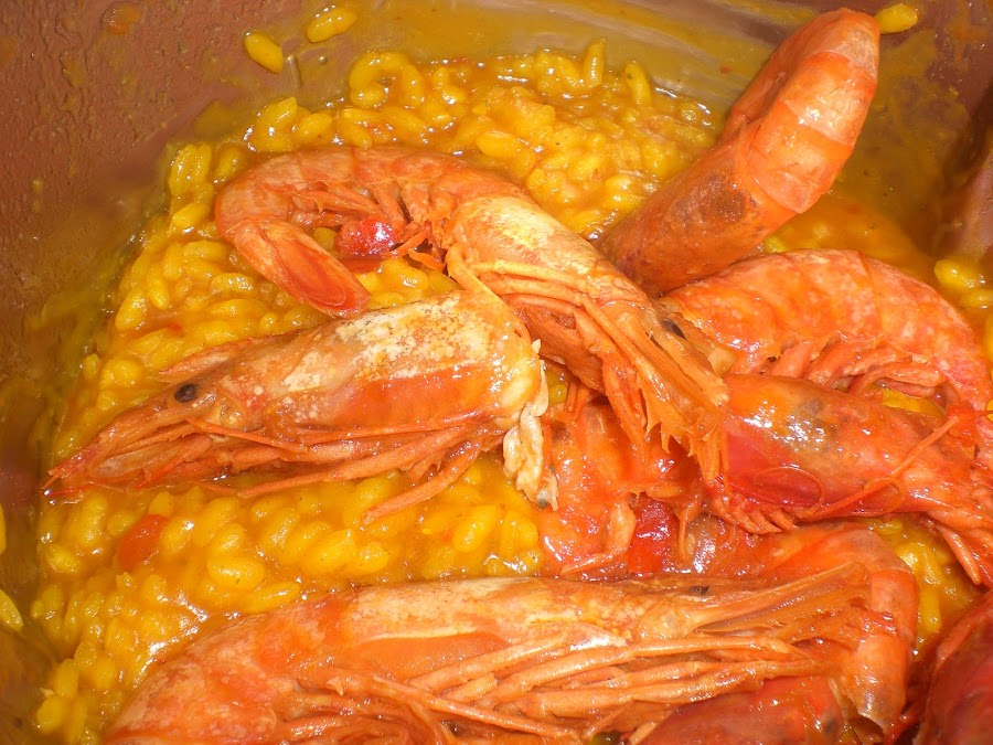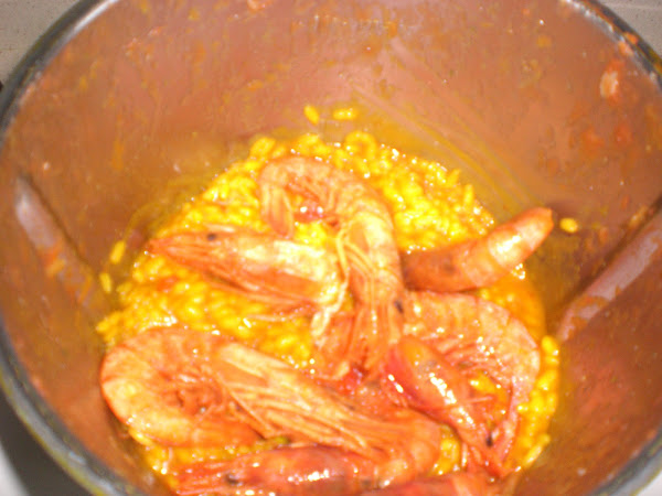 Seguidamente agregamos los calamares y las gambas, tanto gambones como las rojas pequeñas. Programamos 7 min/ varoma/ giro izq. vel cuchara.