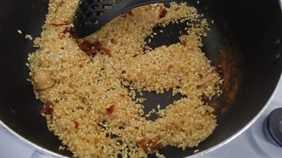 En la misma cazuela con dos cucharadas más de AOVE y una pizca de cúrcuma, sofreímos el arroz durante 3 minutos, removiendo.