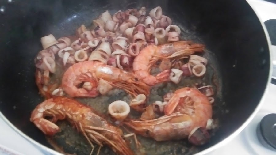 Lavamos los gambones y los calamares, escurrimos, secamos y ponemos en una cazuela con 4 cucharadas de AOVE, hasta que estén dorados y hayan perdido su agua. Sacamos a un plato.