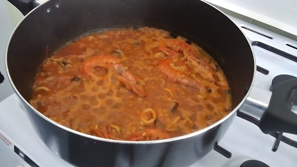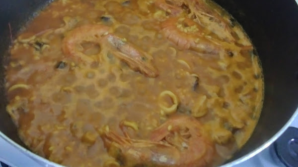 Agregamos el caldo y llevamos a ebullición. Incorporamos los gambones y los calamares. Rectificamos de sal y dejamos que cueza a fuego medio durante 10 minutos. No removemos.