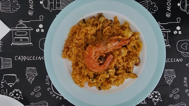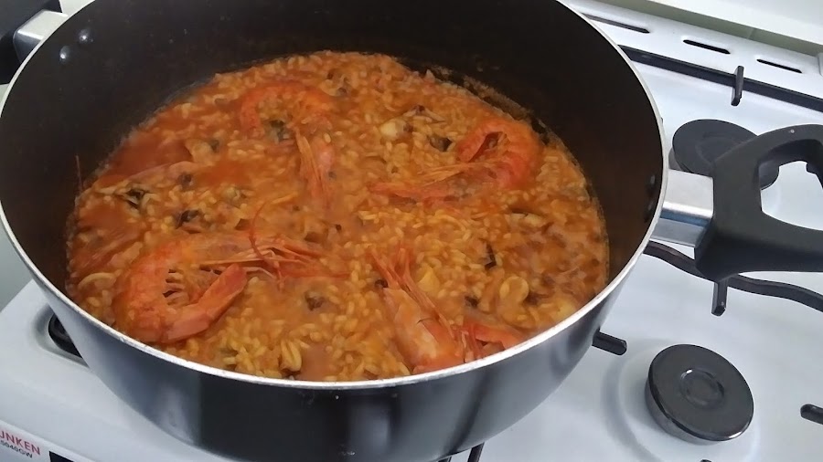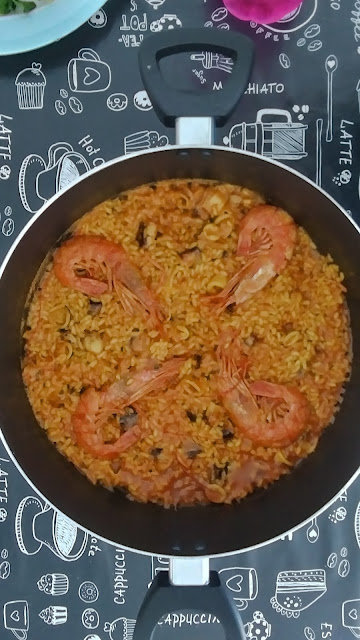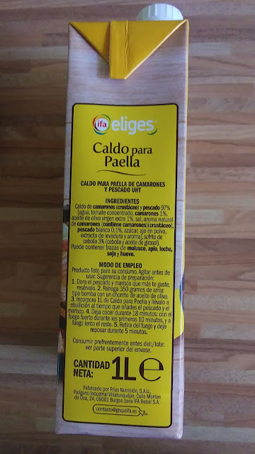 Con este brick en concreto de la marca eliges que encontré en el supermercado Family Cash, viene incorporado un sofrito de cebolla, con lo que hacer este arroz, no nos lleva más de 20 minutos, más el tiempo en el que se hace el arroz, otros 20. Es muy práctico, además como queda seco, lo que sobra aguanta bien para el día siguiente. Seguí las indicaciones del fabricante y quedó un arroz de lo más resultón. También me gustó que los ingredientes fueran naturales: Caldo de camarones (crustáceo) y pescado 97% [agua, tomate concentrado, camarones 1%, aceite de oliva virgen extra 1%, sal, aroma natural de camarones (contiene camarones) (crustáceo), pescado blanco 0,1%, azúcar, ajo en polvo, extracto de levadura y aroma], sofrito de cebolla 3% (cebolla y aceite de girasol). Contiene pescado y crustáceos. Puede contener trazas de molusco, apio, leche, soja y huevo.