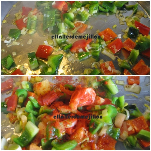 Cortamos los ingredientes para el sofrito: el puerro y los pimientos, los ponemos en una paellera con 30 ml de aceite de oliva. Rehogamos y añadimos el pimentón con cuidado de que no se queme.