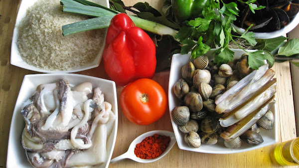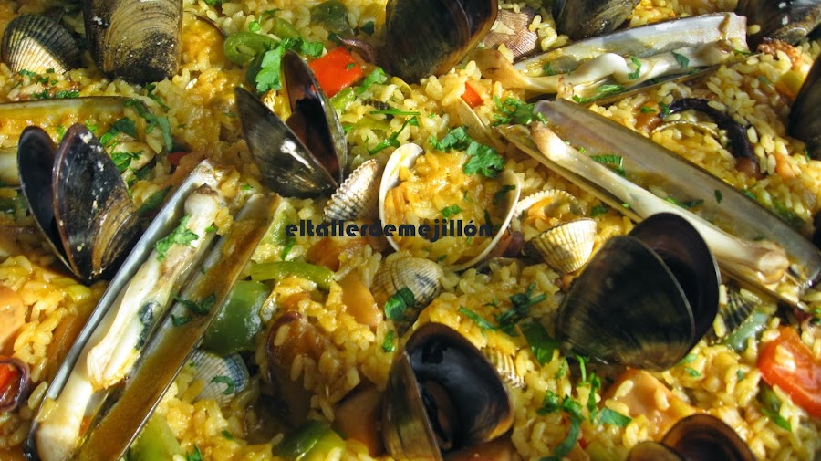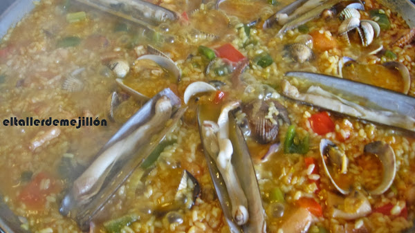 El arroz estará listo en 15-20 minutos después de añadir los berberechos y almejas, según el gusto de cada persona. Yo pongo los mejillones para la decoración, aunque también se pueden desconchar algunos y los añadimos en el momento que pongamos las navajas.