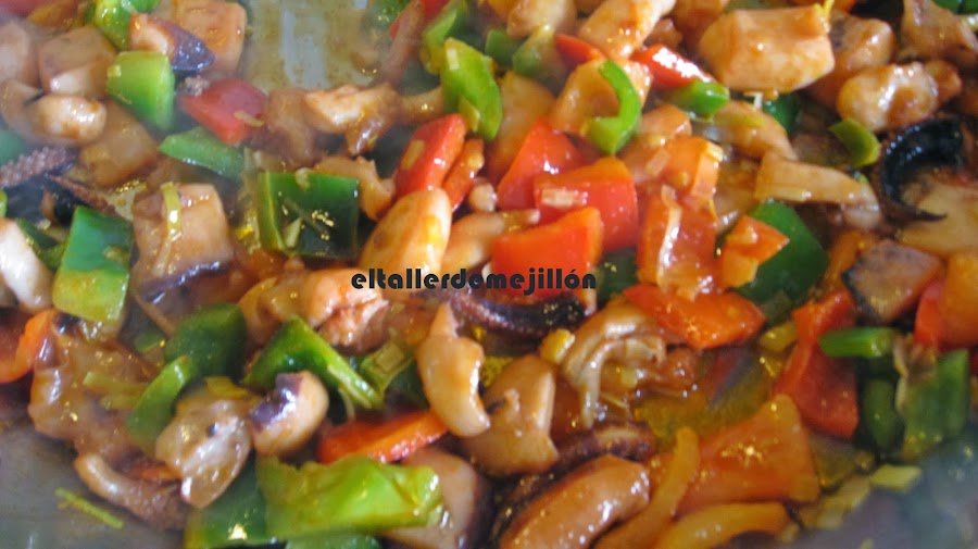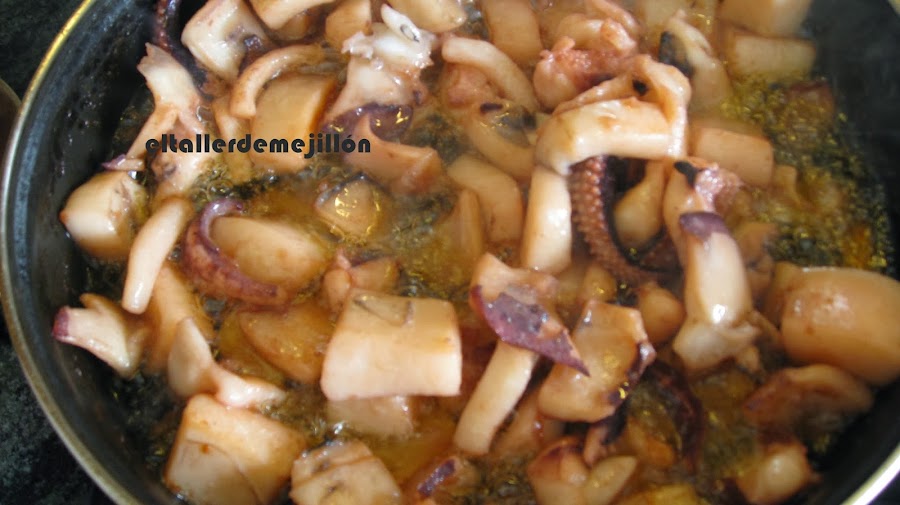 Normalmente corto la sepia en trozos grandes, la sofrío en abundante aceite muy caliente