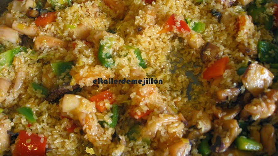 Agregamos la sepia que previamente hemos sofrito que iremos mezclando con los ingredientes que ya tenemos en la paellera.
