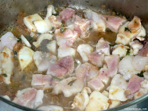 Si queda aceite o si hace faltar un poco más agregar y freír el calamar y seguidamente la sepia, añadir seguidamente el tomate rallado. Mezclar y freír todo hasta que termine de hacerse.