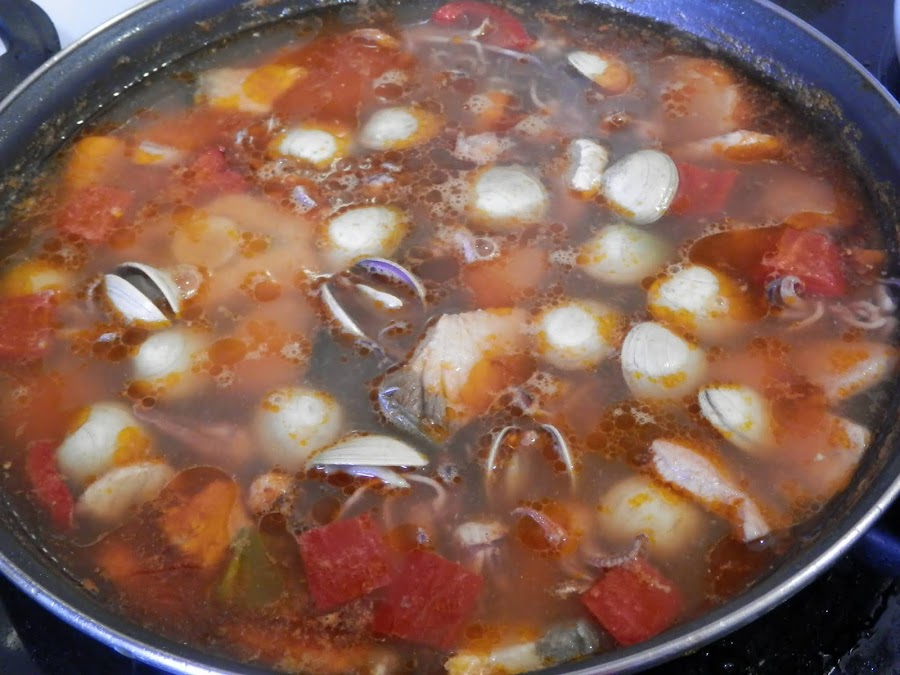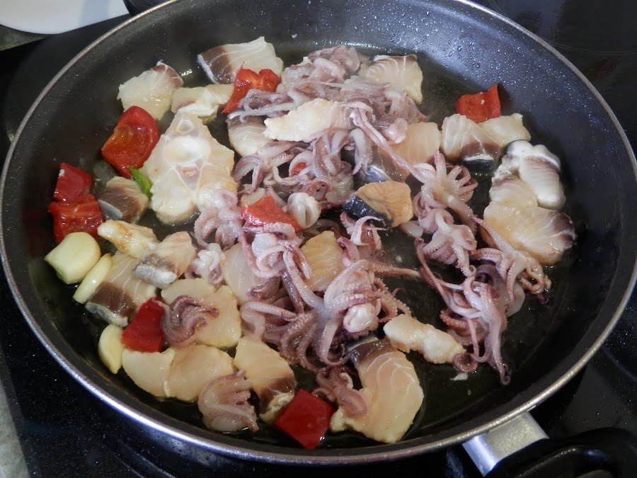 Trocea el cazón y añade a la sartén junto a los calamares.