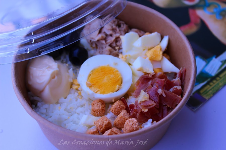 - Cuando estén cocidos los huevos, picamos uno en cada plato. Cuando este el arroz, la escurrimos y la repartimos en 2 platos, echamos la mayonesa a nuestro gusto y removemos.