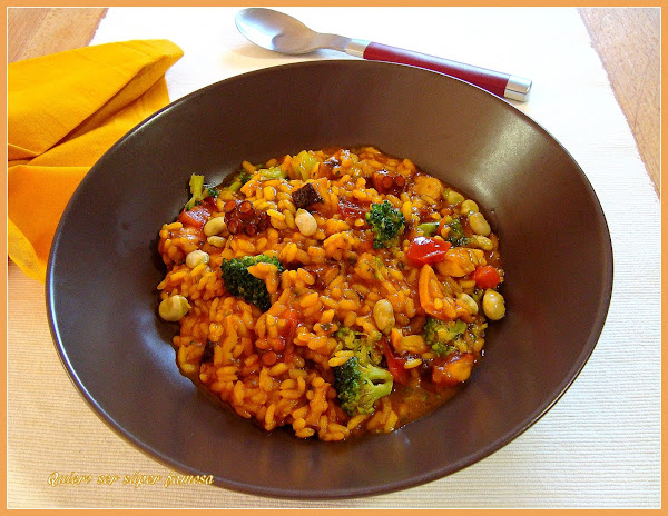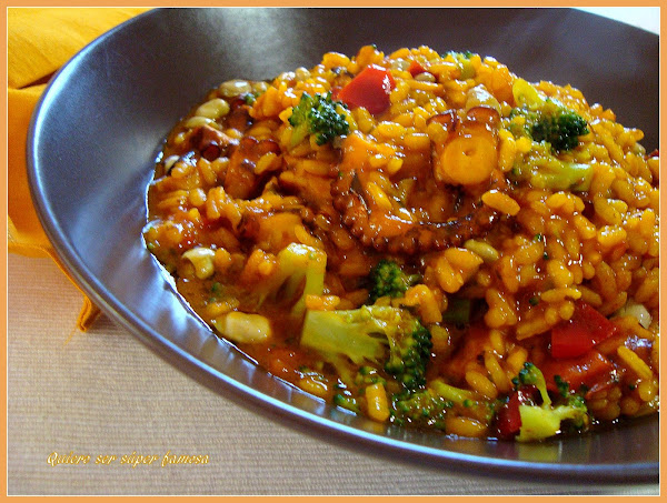 Estuve a punto de poner en el título "Arroz de pulpo a mi manera" porque realmente lo es. Lo cierto es que la verdura lo aligera mucho y al añadir el doble de caldo que le corresponde queda muy meloso.. Este plato ha superado con creces las expectativas que tenía puestas en él cuando me rondaba la receta por la cabeza. Igual un día voy a un restaurante y me sirven el arroz de pulpo de mi vida, pero hasta que eso no ocurra y con lo exigente que me he vuelto uff!.