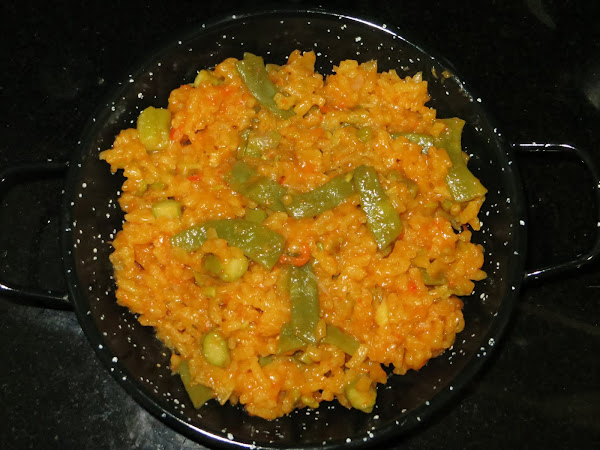 Agregamos el arroz, el pimentón, el colorante y mezclamos con la espátula. Añadimos el caldo y programamos velocidad 1, temperatura 105ºC, potencia de calor 7 durante 12 minutos. Una vez finalizado el tiempo dejamos reposar unos minutos y servimos.