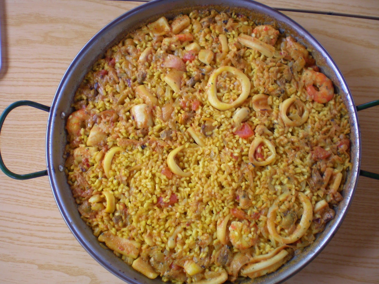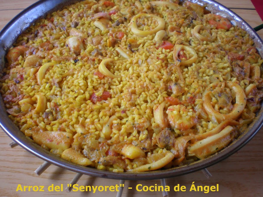 En la paellera (o en la paella como debería decirse) poner un buen chorro de aceite y sofreir la cebolla cortada finita. Añadir el tomate pelado y cortado en trocitos. Añadir los calamares, las almejas y los gambones junto con un poco de pimentón y dar unas vueltas. Añadir el arroz (midiendo su volumen con algún vaso) y el doble de su volumen del caldo. Incorporar un poco de ñora molida y colorante alimentario y dejar que se consuma el caldo, vigilando que el arroz se haga y si hubiera que añadir un poco de caldo. Retirar del fuego y dejar reposar tapado unos diez minutos.