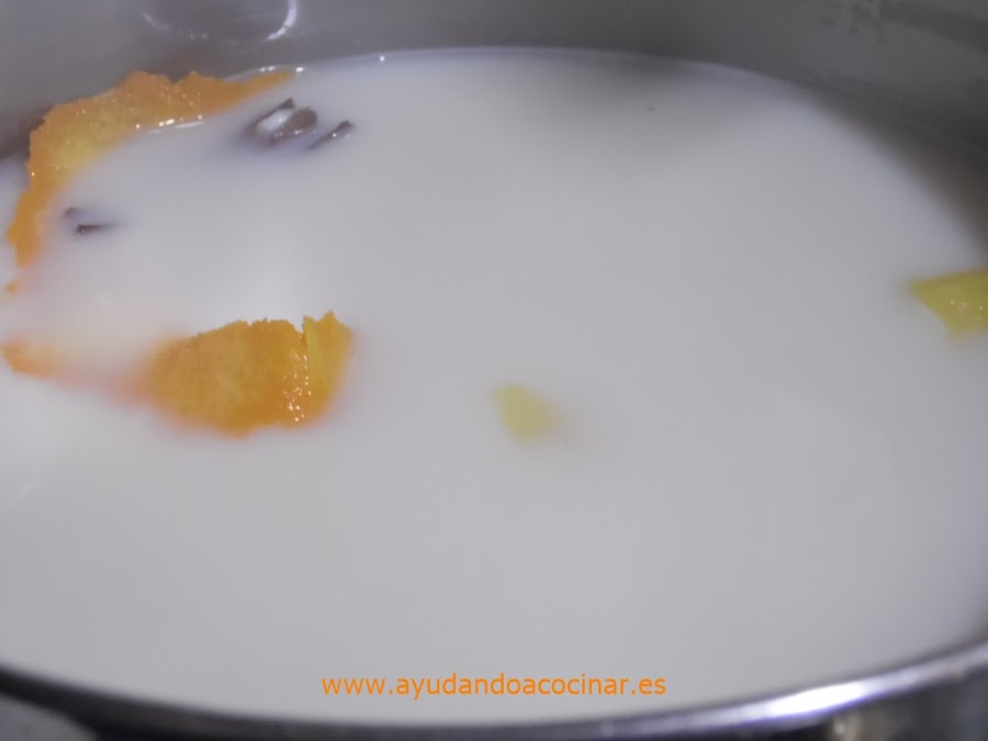 Retirar las pieles de limón, naranja y la canela en rama. Reservar.