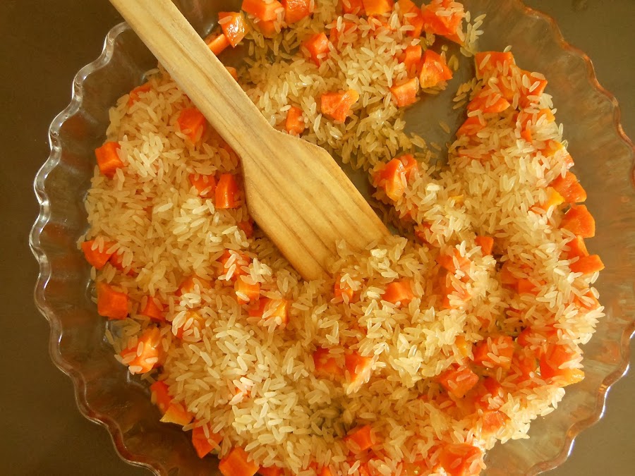 Transcurrido el tiempo, saca el recipiente del microondas con tus guantes de cocina y mezcla el arroz con las zanahorias cocidas.