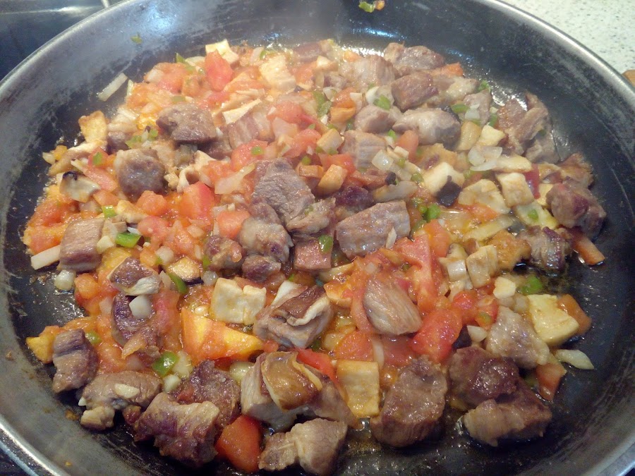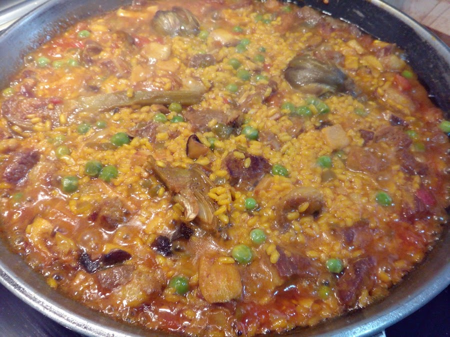 150 grms. de secreto ibérico, 150 grms. de cabezal ibérico, un tomate maduro, un pimiento verde tipo italiano, tres dientes de ajo, media cebolla fresca (tipo cebolleta), una alcachofa, 100 grms. de guisantes, 1 seta boletus, una seta shiitake, medio vaso mediano de aceite de oliva virgen extra, cinco puñados de arroz redondo, tipo bomba (suelo usar dos puñados de arroz por persona, más uno de “regalo”, aproximadamente unos 125 grms por persona), agua (la proporción será de 1 parte de arroz por 2 o 2,5 partes de liquido), una cucharada de colorante alimentario y sal.