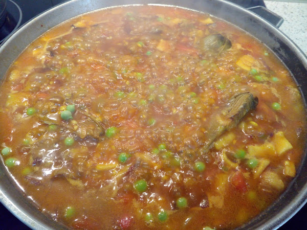 Apartar del fuego, tapar la paellera y dejar reposar unos pocos minutos.