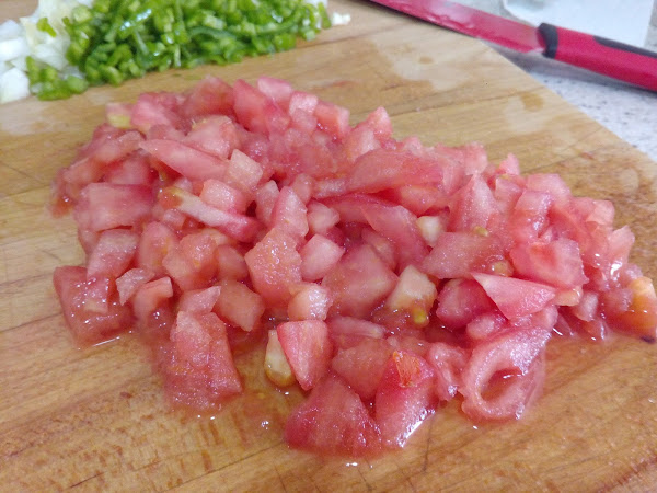 Pelar el tomate, la cebolla y los ajos, lavar el pimiento y cortar todo en trozos pequeños.