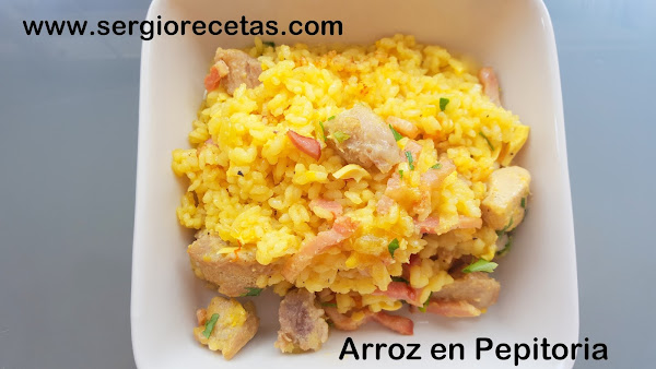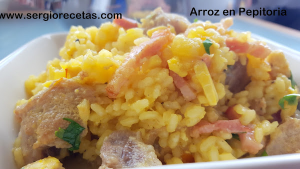 Para elaborar el arroz, una vez que tenemos hecho el caldo es muy sencillo, sólo tendremos que poner una cazuela de lado bajo o una paellera al fuego con un chorrito de aceite de oliva y dorar el bacon cortandolo en tiras y el lomo de cerdo en daditos, añadir el arroz y dejar que se sofria todo junto y por ultimo añadir el doble y un poco más de nuestro maravillosos caldo de Pepitoria,comprobar el sabor y dejar cociendose unos 18 minutos a fuego medio.