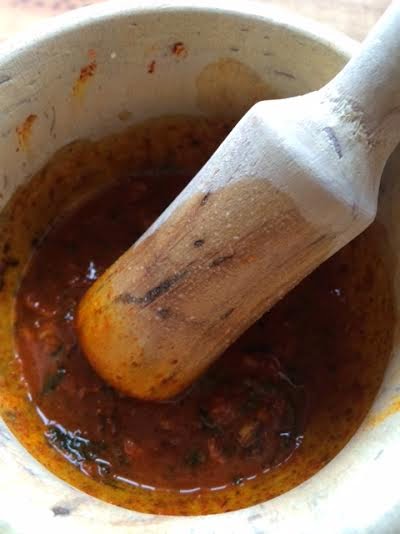 Aparte en un mortero, machacamos ajo, perejil, sal,pimentón y le añadimos el colorante.