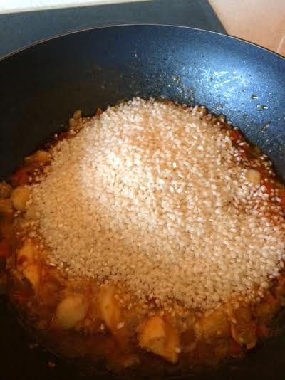 Aparte calentamos el fumet o el agua de las almejas. Yo le puse todo el agua de almejas ,mas un poco de fumet. Si no tenemos podemos calentar agua con una pastilla de caldo de pescado o marisco.Cuando hierva el caldo se lo añadimos y lo dejamos a fuego medio 10 minutos, apartamos y tapamos con un trapo o tapadera para que repose cinco minutos, y ¡Listo!