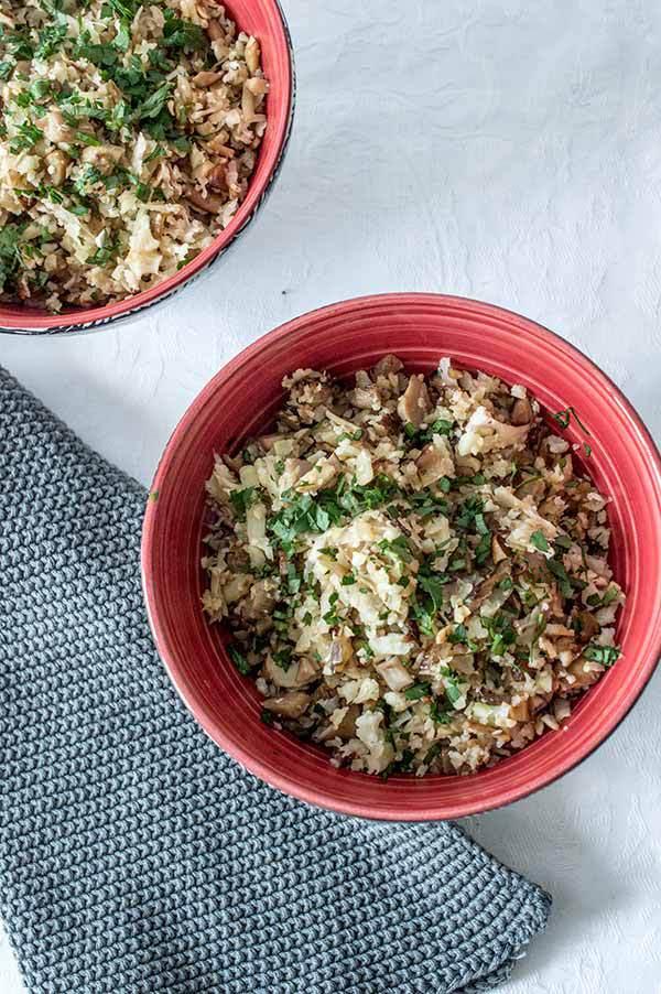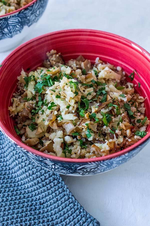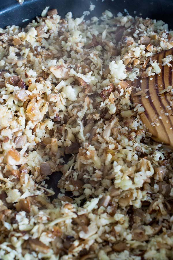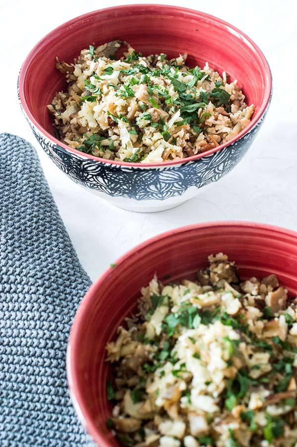 Ya os mostré un día un falso arroz de coliflor con verduras que es muy rico, pero la versión que os enseño hoy es mas rápida y fácil de hacer y queda igualmente deliciosa. Vale tanto para guarnición como plato único. El sabor que le dan las setas es muy rico y ademas con la coliflor se notan los dos sabores y combinan a la perfección!
