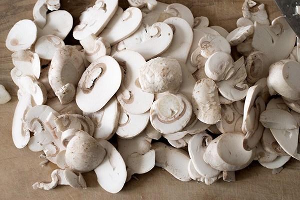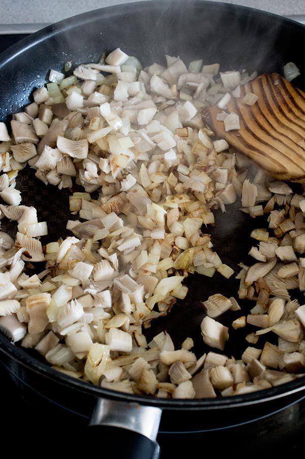 Mientras tanto cortamos las setas del mismo tamaño que la cebolla, la añadimos al sofrito.