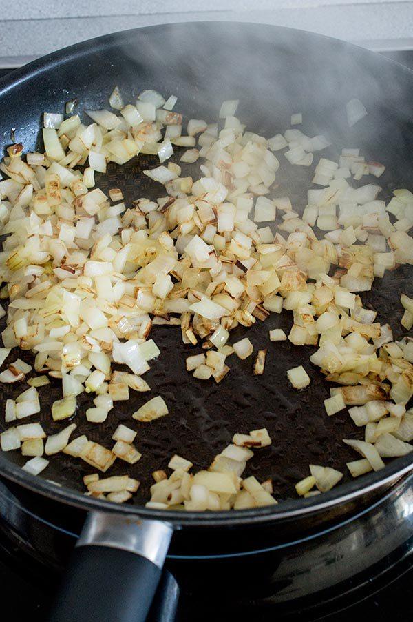 Salteamos la cebolla a fuego fuerte durante 4-5 minutos.