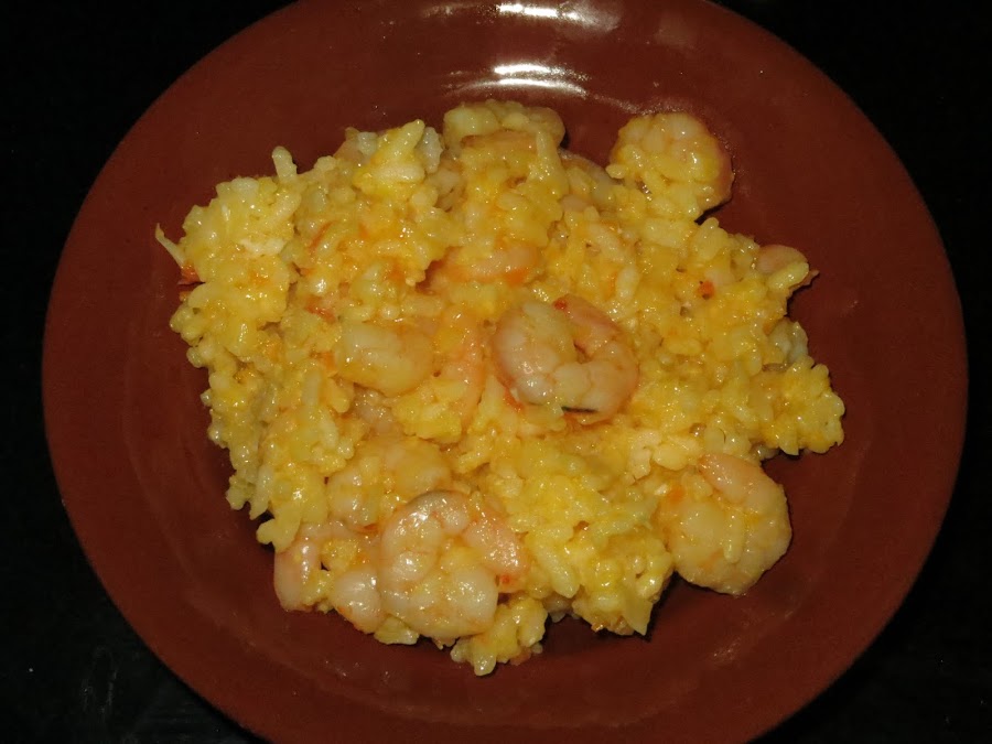 Primero nos ponemos con las verduras, pelamos y picamos el ajo, la cebolla y la zanahoria. En una sartén calentamos el aceite y añadimos la zanahoria, el ajo y la cebolla, luego echamos el tomate rallado y cuando ya se ha cocinado un poco los gambones y el huevo que freímos rompiéndolo en trocitos.