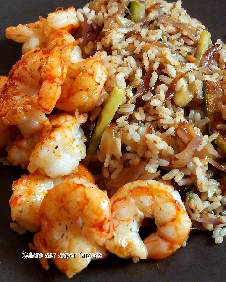 Añadir el arroz frio a las hortalizas. Saltear a fuego medio. Condimentar con las especias menos el pimentón que lo reservamos para los gambones. Si hace falta sal añadir un poco más. Podéis reservar al arroz en el horno a 50º el tiempo que se cocinan los gambones.